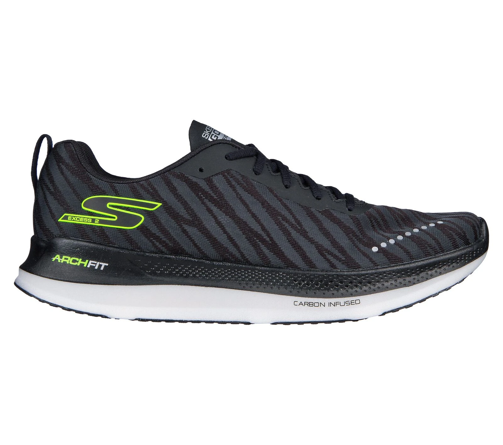 Go the distance in long-lasting support and comfort wearing Skechers GO RUN® Razor Excess 2. This lace-up carbon infused design features a mono mesh upper, removable Arch Fit® insole, HYPER BURST® cushioning, Goodyear® Performance Outsole, plus Skechers HYPER ARC™ for an efficient run.