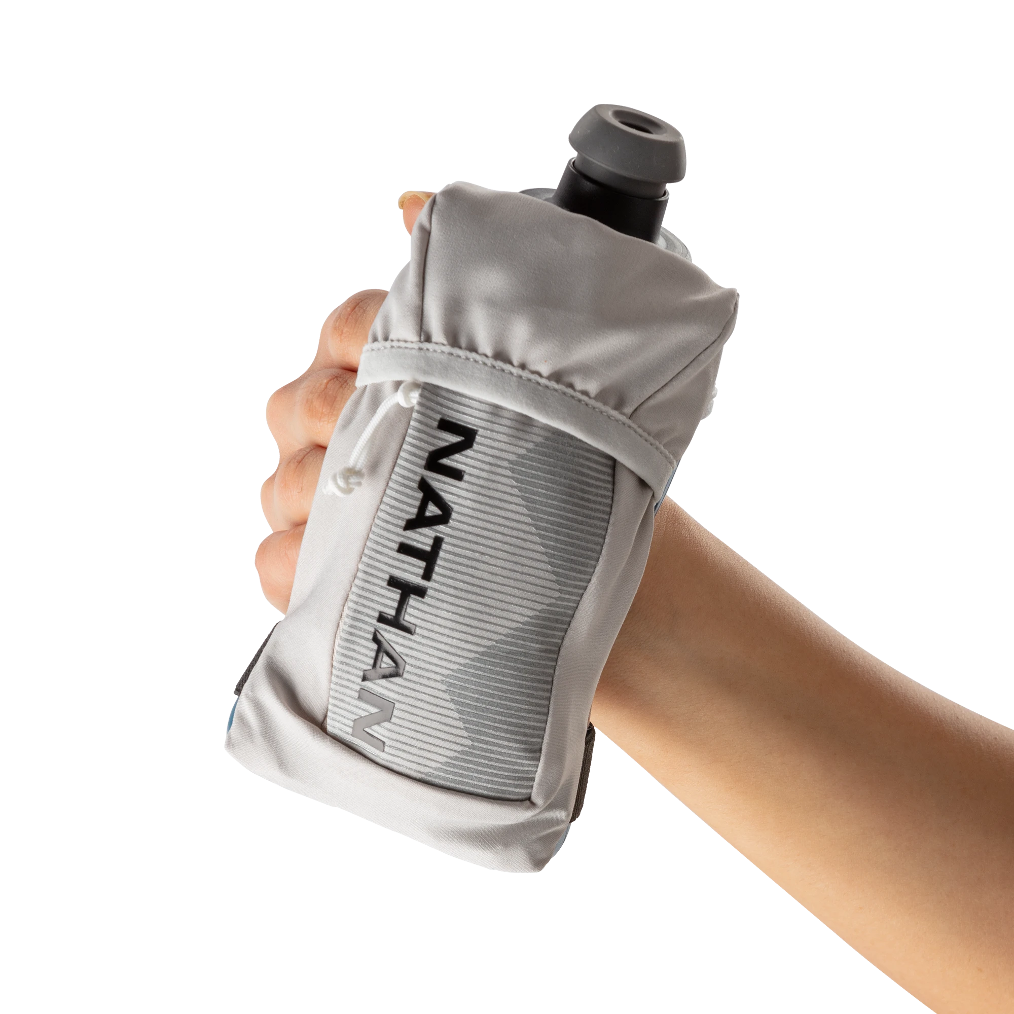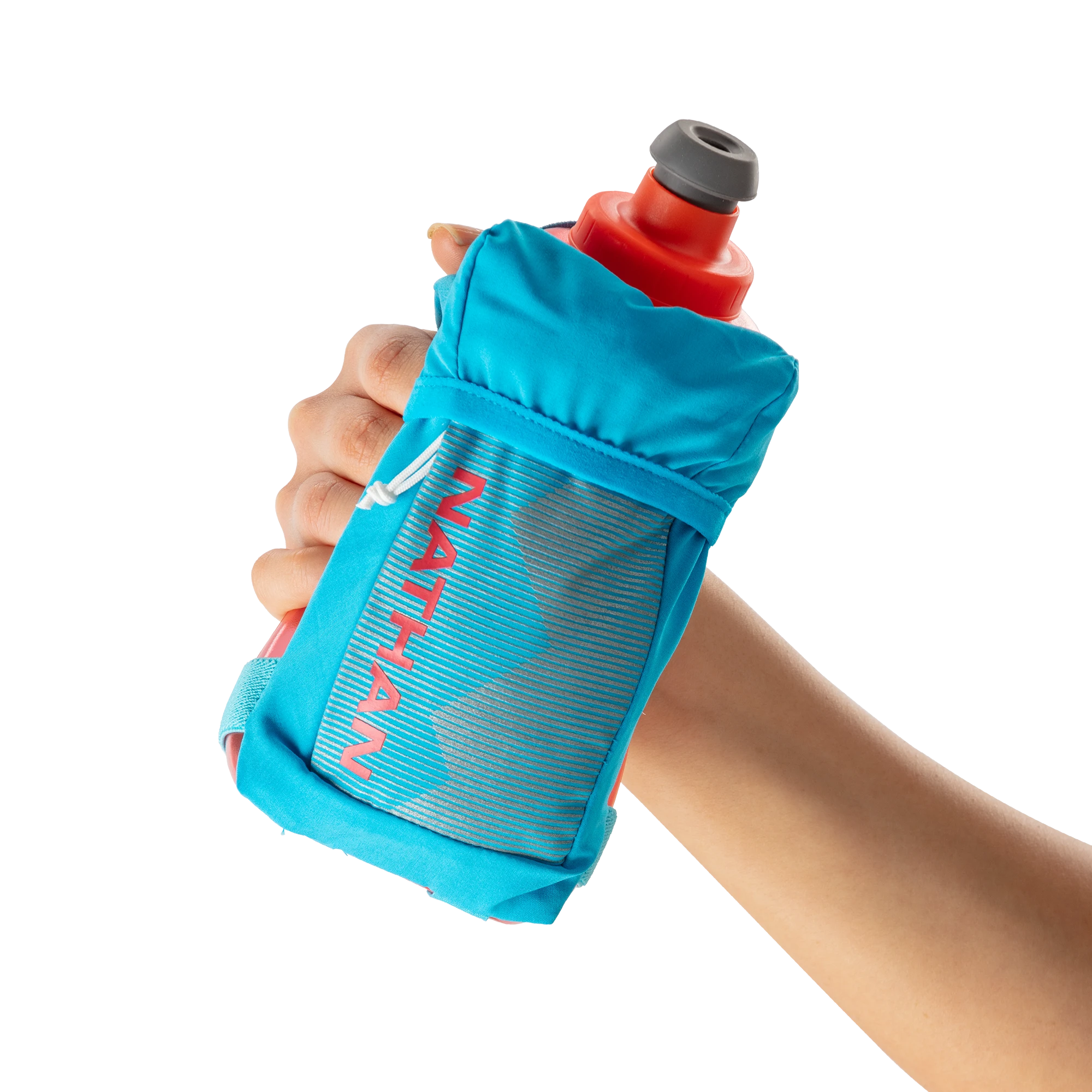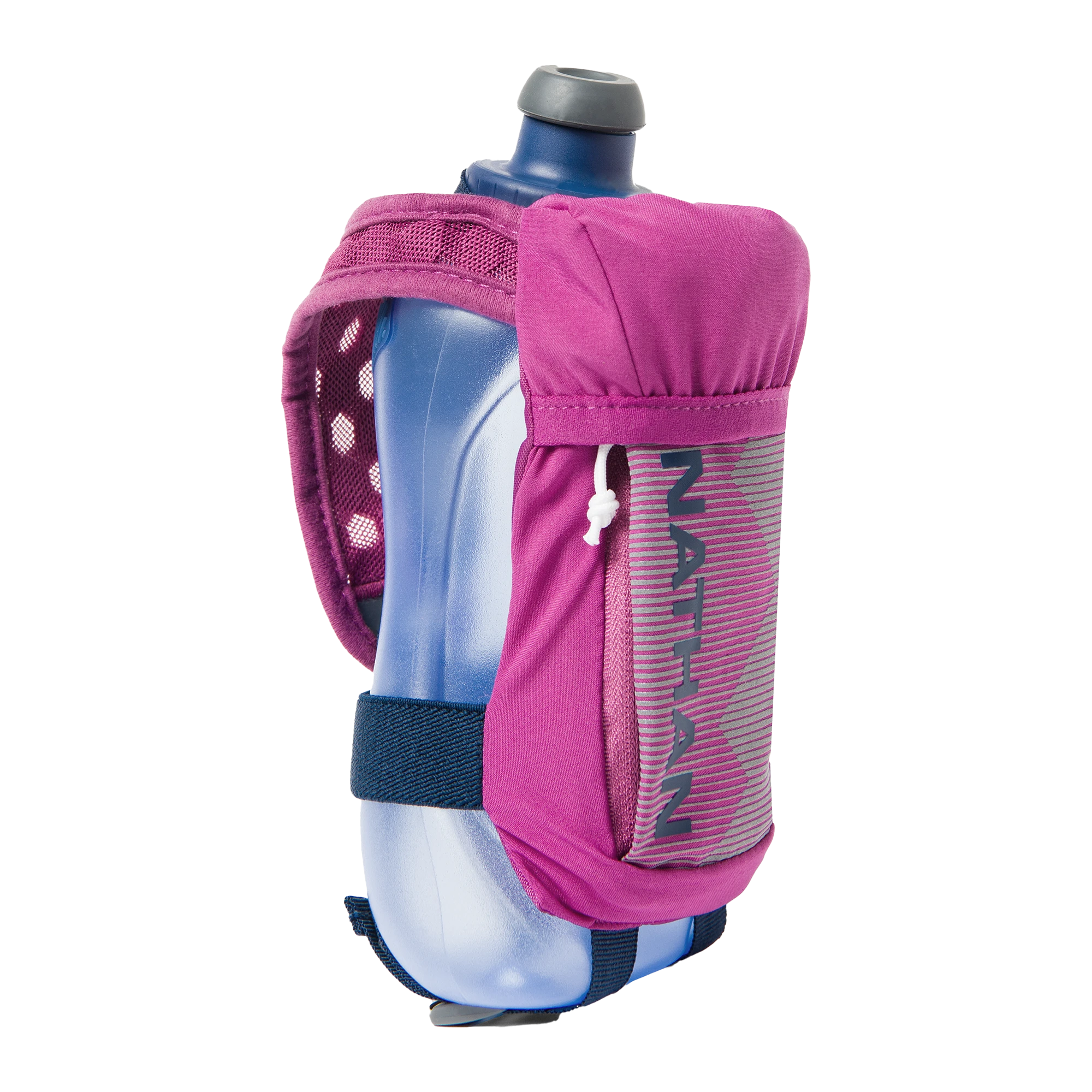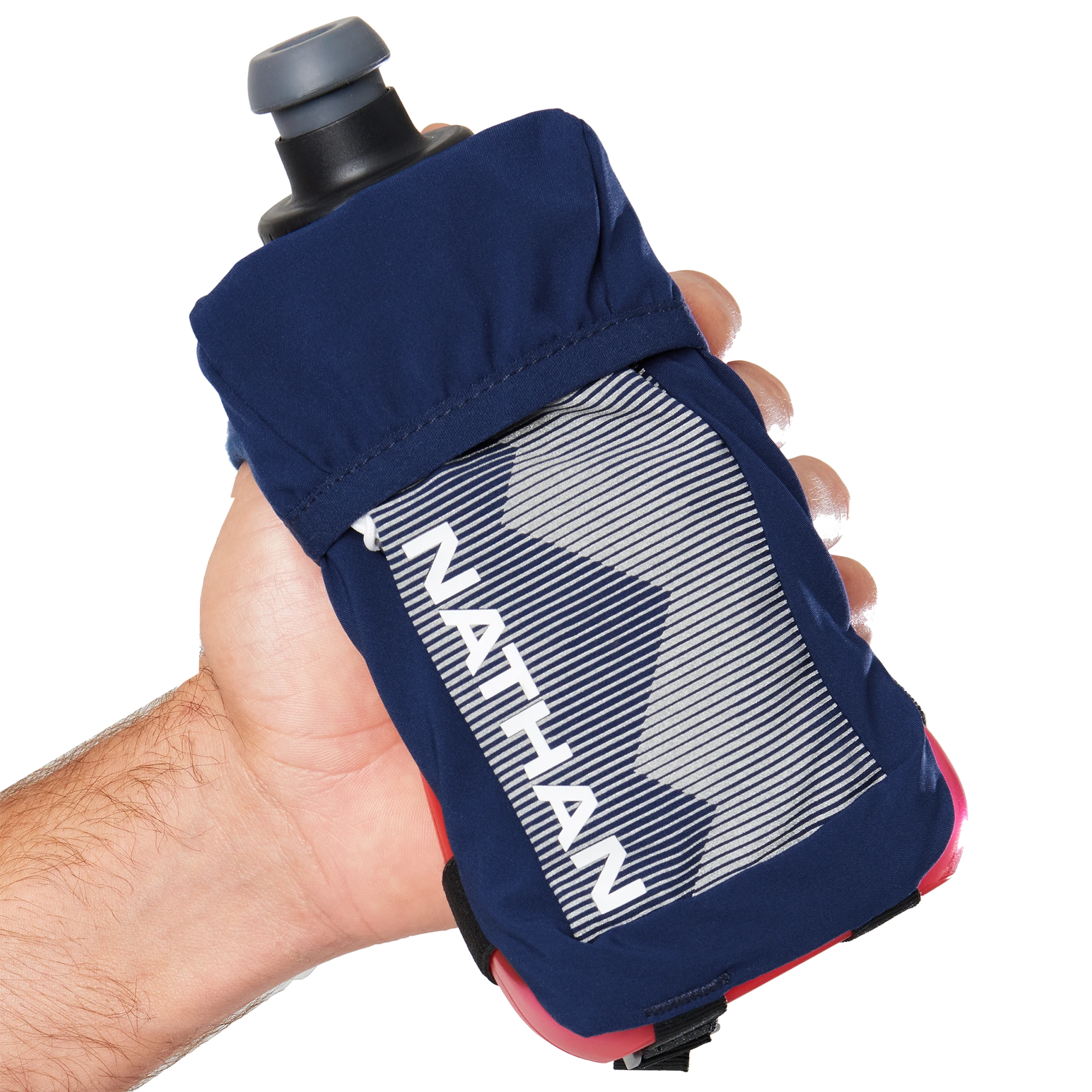 Designed as the ultimate hydration handheld ideal for running, hiking, walking and other sports. The QuickSqueeze 18oz Handheld features a grip-free, fully adjustable hand strap and storage for your phone and more.