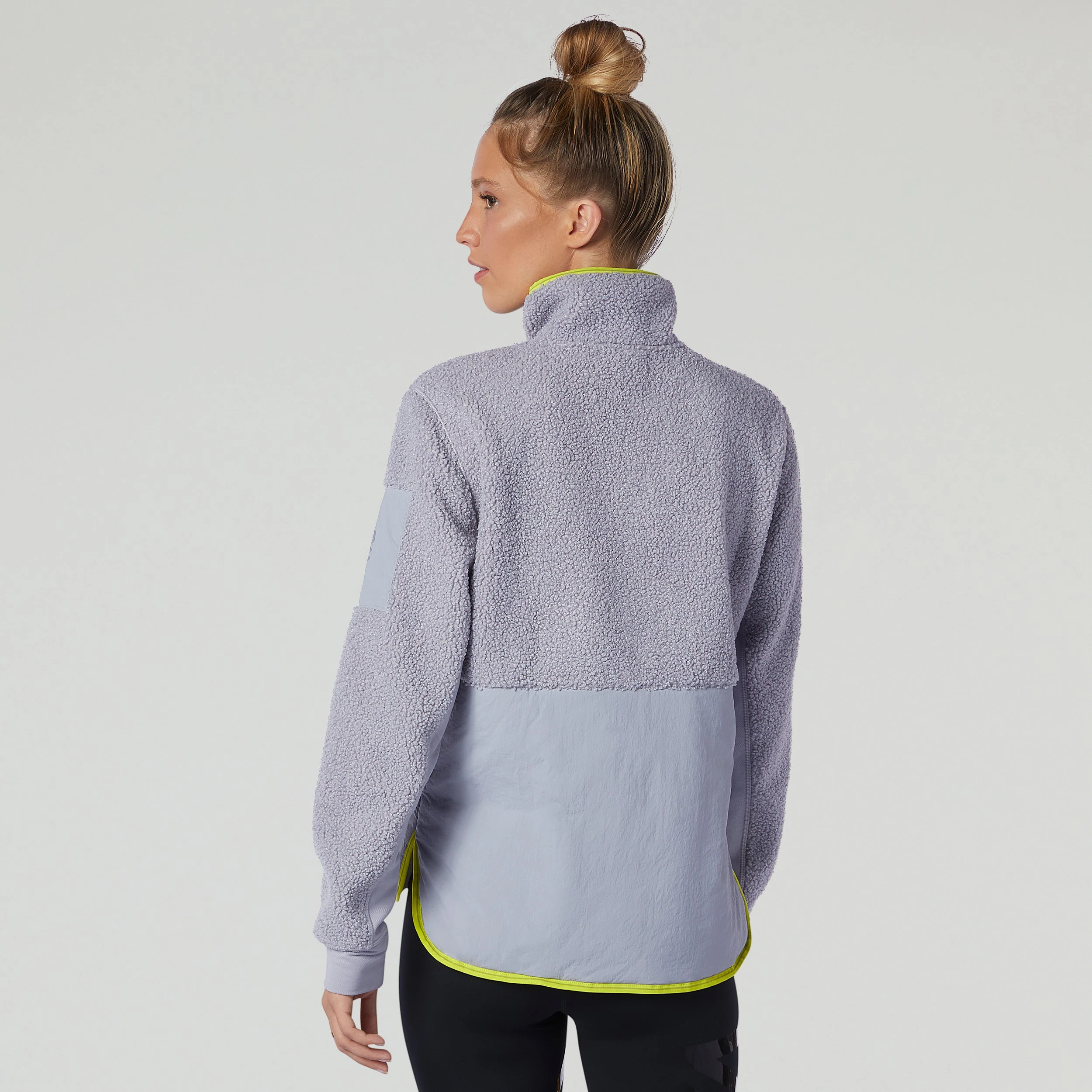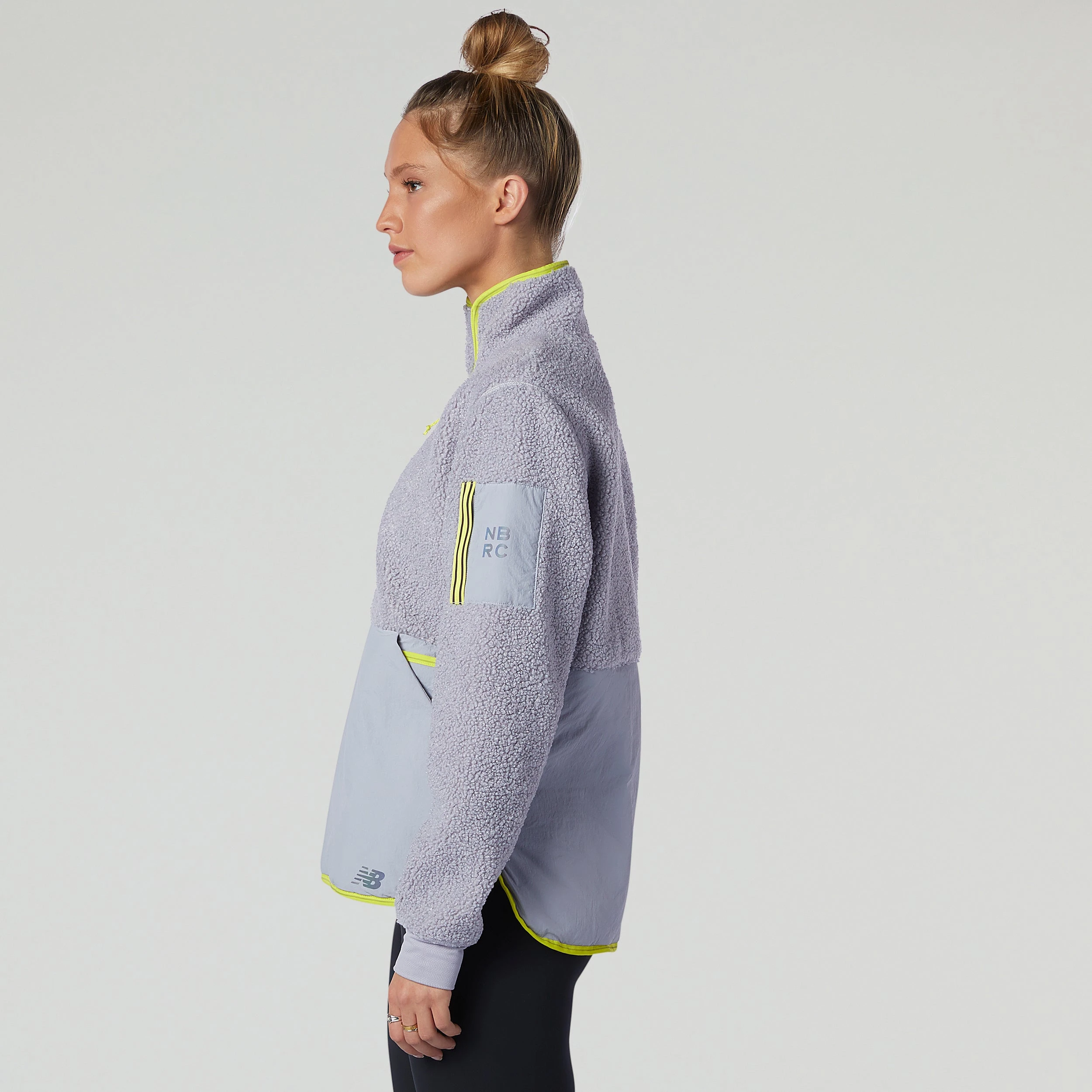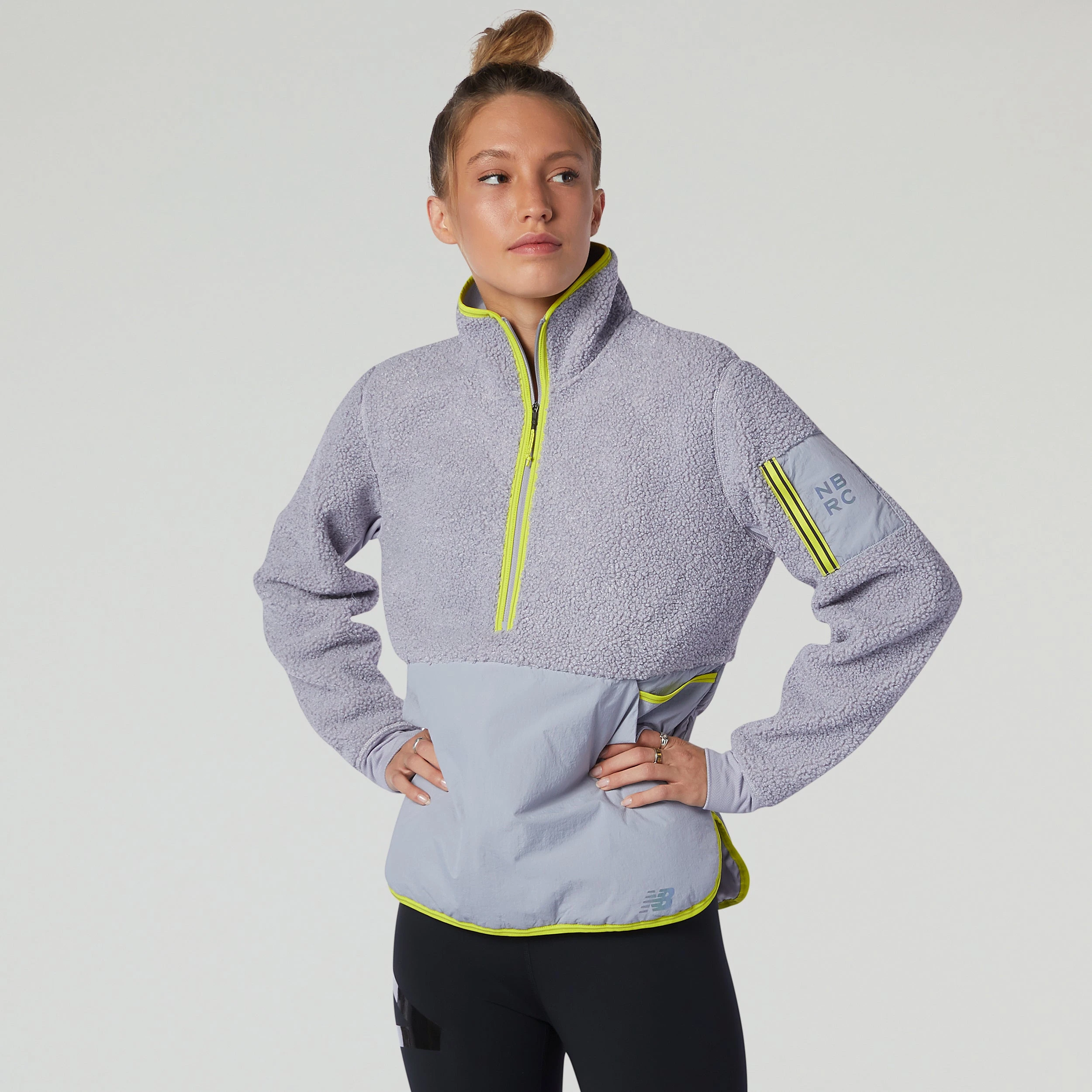 The Q Speed Sherpa Anorak pulls inspiration from urban run crews and unsanctioned races to create a fashionable and functional layering piece. Crafted from Sherpa fleece and water-resistant woven materials, this women’s jacket is a cozy choice to wear during warm-ups or after a run. NB HEAT technology wicks away moisture while adding warmth and a bungee pull at the front hem allows for custom comfort. A kangaroo pocket with internal stash pocket makes it easy to store small essentials while you’re on the go.