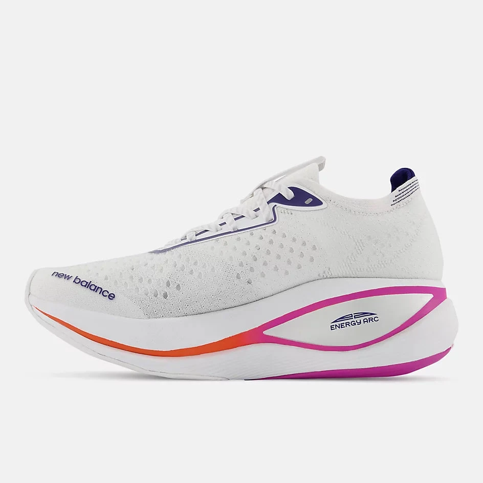 The FuelCell SuperComp Trainer brings the seconds count performance of energy-return technology from race day to a high milage training shoe. In this execution of new Energy Arc technology, a stacked height midsole houses an arched carbon fiber plate, sandwiched between two layers of FuelCell cushioning, leaving a hollow channel through the middle of the shoe. The plate is flattened into the void with each foot strike, and returns energy as it reshapes, creating a high rebound sense of propulsion. The FuelCell SuperComp Trainer is designed to look, feel, and perform differently.